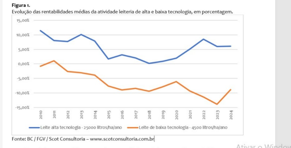 Os pequenos produtores têm sido os mais impactados. Levantamentos da Scot Consultoria indicam que sistemas de baixa tecnologia, com produtividade média de 4,5 mil litros por hectare ao ano, registraram uma rentabilidade negativa de -8,86% em 2024. Esse cenário marca o 13º ano consecutivo de perdas para esse perfil de produtor.