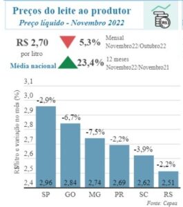 Segundo a Embrapa, o preço pago ao produtor reduziu 5,3% em novembro, o que seria reflexo do aumento da importação de lácteos. Na média nacional, o preço pago ao produtor ficou em R$2,70 o litro. No entanto, mesmo com a queda, a cadeia acumula um acréscimo de 23,4% no preço pago ao produtor nos últimos 12 meses.