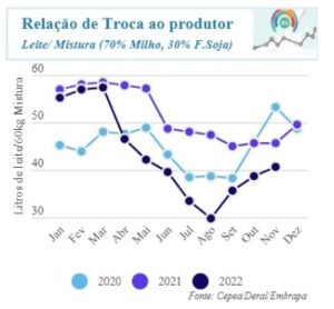 E a relação de troca leite/ mistura pelo terceiro mês consecutivo piorou para o pecuarista. No entanto, se encontra mais favorável que em novembro dos últimos dois anos. Foram necessários 40,7 litros de leite para aquisição de 60 kg de mistura, contra 45,7 litros observados em novembro/21. No varejo, o preço da cesta de lácteos apresentou decréscimo de 3,3% em outubro, influenciado pela queda do leite UHT de 7,1%. Em 12 meses, no entanto, a cesta subiu 22,5%, ficando acima da inflação oficial brasileira, o IPCA, que acumulou 5,9% em 12 meses.