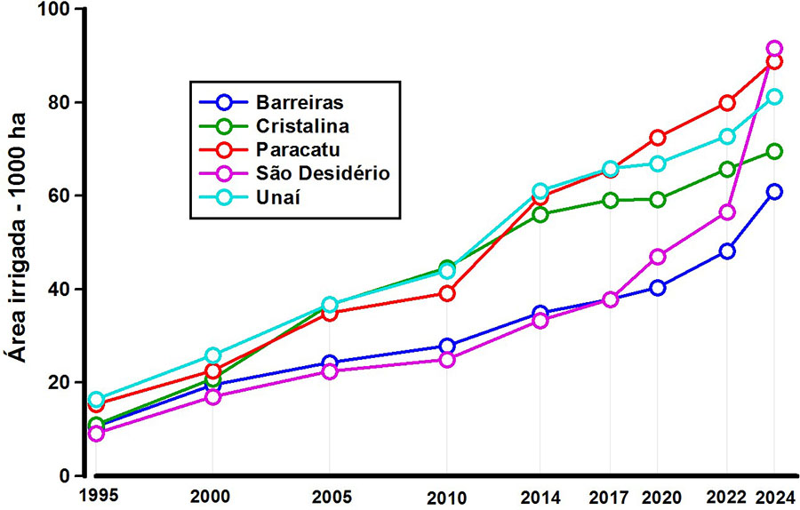 De acordo com Guimarães, esse crescimento está relacionado às condições topográficas, às facilidades de implantação dos empreendimentos, ao uso das águas do Aquífero Urucuia e ao armazenamento da água de irrigação em tanques de geomembrana. “As tendências de crescimento das principais áreas irrigadas mostram que em breve o município de Barreiras (BA), também deverá superar Cristalina, (GO)”, adianta o pesquisador. Segundo ele, Minas Gerais continua sendo o estado com maior área irrigada por pivôs centrais no País (637 mil hectares), e a Bahia superou Goiás, ocupando atualmente o segundo lugar, com uma área irrigada de 404 mil hectares.