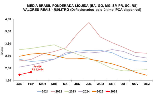Apesar da recuperação recente, o cenário ainda exige atenção. Em termos reais, o valor pago ao produtor segue 25,45% abaixo de fevereiro de 2025, considerando a inflação medida pelo IPCA.